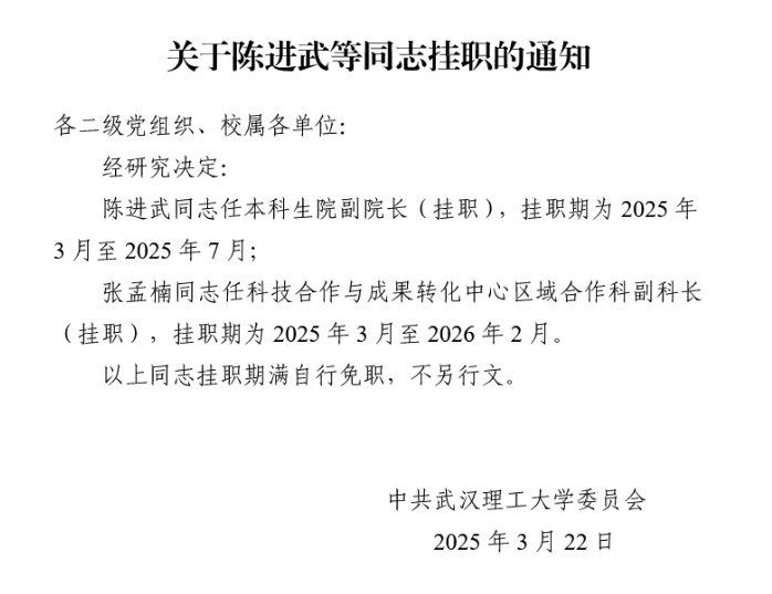 校党组字〔2025〕4号 关于陈进武等同志挂职的通知