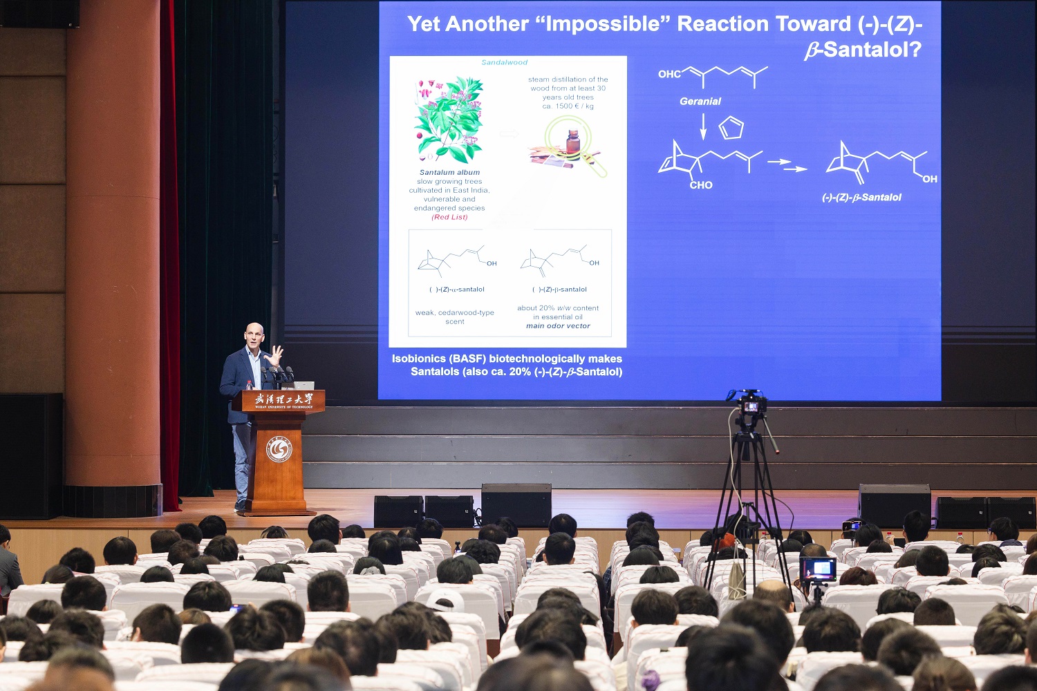 李斯特对受聘为学校名誉教授感到十分荣幸,对学校在相关学科领域取得的成果深感钦佩,将积极推动双方在科研合作与人才培养等领域的交流与协作。李斯特教授以《Organocatalysis Makes Scents》为主题,为现场师生带来了一场生动而深刻的学术报告。他用通俗易懂的方式讲解了有机催化领域的最新研究动态,并与师生展开了热烈的互动问答。